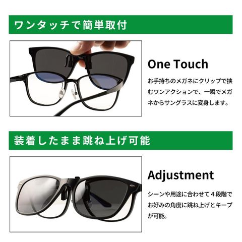 ●ワンタッチでご自身のメガネに取り付け可能。お手持ちのメガネが一瞬でサングラスに変わります。