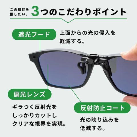 ●運転や釣り、アウトドアに最適な「偏光機能付きレンズ」を使用し、眩しさや光の反射を効果的にカットしてくれます。