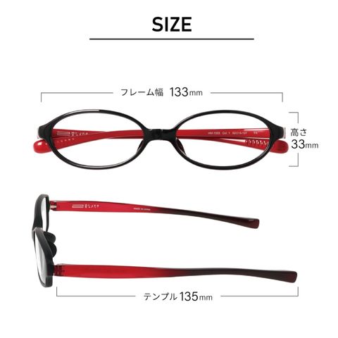 フレーム幅:133mm、高さ:33mm、テンプル長:135mm