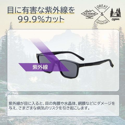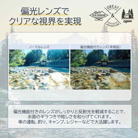●運転や釣り、アウトドアに最適な「偏光機能付きレンズ」を使用し、眩しさや光のギラツキを効果的にカットしてくれます。