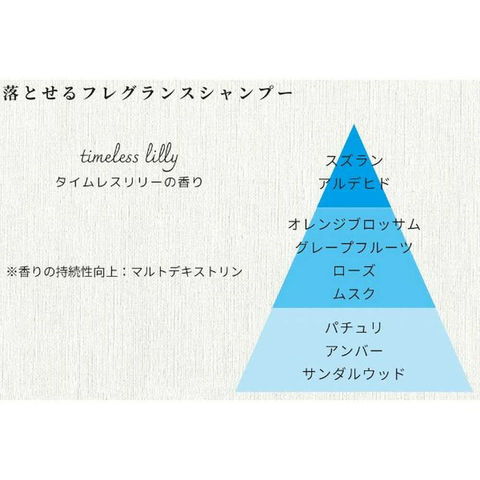 水、コカミドプロピルベタイン、コカミドDEA、ココイルグルタミン酸TEA、ラウロイルメチルアラニンNa、コカミドメチルMEA、ココイルメチルタウリンNa、加水分解ケラチン(羊毛)、加水分解コラーゲンPGプロピリメチルシランジオール、加水分解ウールキューティクルタンパク、ホスファチルジルコリン、パンテニルヒドロキシプロピルステアルジモニウムクロリド、メドウフォーム-δ-ラクトン、γ-ドコサラクトン、ベタイン、アボカド油、オリーブ果実油、アルガニアスピノサ核油、オプンチアフィクスインジカ種子油、ポリクオタニウム-7、ポリクオタニウム-10、マルトデキストリン、クエン酸、DETA-2Na、カプリル酸グリセリル、エチルヘキシルグリセリン、メチルパラベン、フェノキシエタノール、香料、赤104(1)、赤227