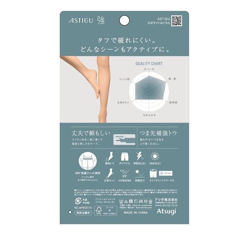タフで破れにくい。どんなシーンもアクティブに。ナイロン糸を二重に巻いて強度と美しさをキープ。つま先補強。ダイヤマチ。UV対策成分配合。制菌加工。においにくい光触媒加工。足型セット。静電気防止加工。吸汗加工。オリジナルバックマーク付。