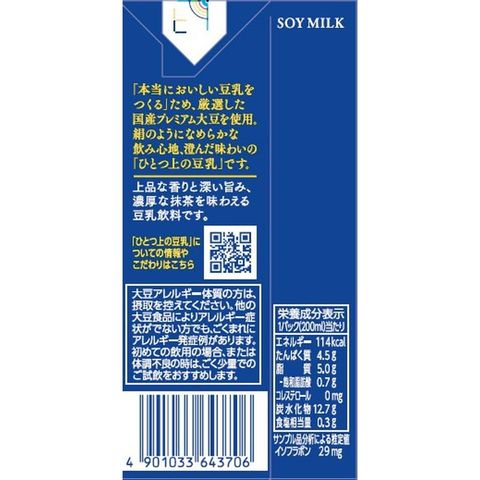本当においしい豆乳を作るため、厳選した国産プレミアム大豆るりさやかと宇治抹茶を使用。絹のようになめらかな飲み心地、澄んだ味わいのひとつ上の豆乳です。