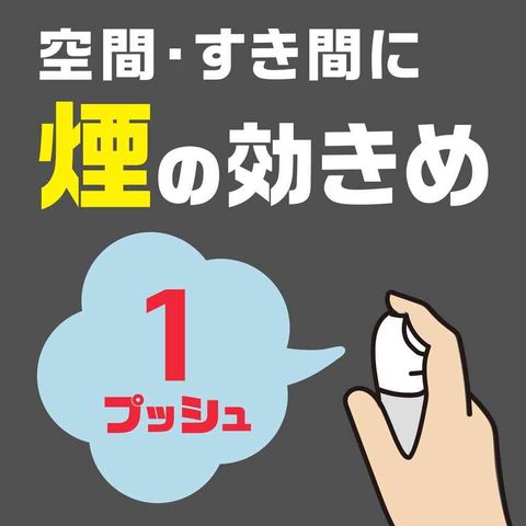 ●ムカデ・コバエ・アリなど、家中のイヤな虫をまるごと退治! ●事前準備不要! (1)部屋の広さに合わせた回数を斜め上にプッシュ! ●部屋の広さ/プッシュ回数:1.5畳/1プッシュ、4.5畳/3プッシュ、6畳/4プッシュ、9畳/6プッシュ、12畳/8プッシュ (2)室内にいてもOK! (3)すき間の奥まで薬剤が広がり、家中のイヤな虫がいなくなる ●イヤな虫をまるごと退治+発生予防 ●バリア効果で、イヤな虫のいない空間を1ヵ月作る!(使用環境により異なります) ●使用後の掃除不要! 【対象害虫】ムカデ、ショウジョウバエ、キノコバエ、チョウバエ、アリ、クモ、ユスリカ、チャタテムシ、シバンムシ、カツオブシムシ、ヤスデ、ゲジゲジ、ダンゴムシ、ワラジムシ、カメムシ、ガ、コクゾウムシ等 60種以上 【使用範囲】約80プッシュ分(最大120畳分)