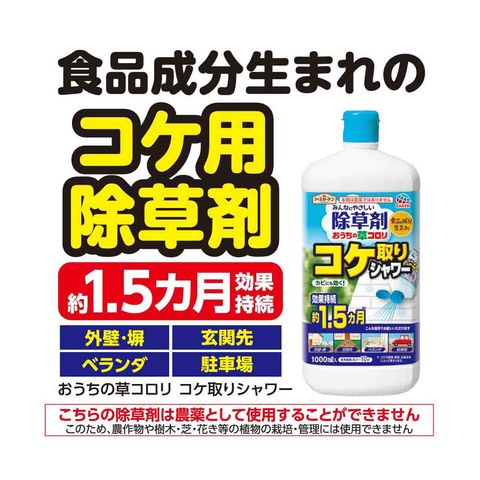 アースガーデン おうちの草コロリコケ取りシャワー 1000ml。食品成分(ペラルゴン酸)から作られたシャワータイプの除草剤です。コケの繁殖を約1.5ヵ月抑制し、カビも防ぎます。