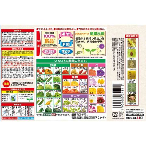 はじめての植物に使用する場合は使用者の責任において事前に薬害の有無を確認してから使用してください。_x000D_ ●飲み物ではありません。_x000D_ ●目や口に入ったときは、水でよく洗い流してください。_x000D_ ●万一身体に異常が起きた場合は、医師に相談してください。_x000D_ ●開花時には花弁にかからないようにしてください。_x000D_ ●弱った植物や病害虫が多発生した植物には、効果が劣る場合があります。_x000D_ ※ 散布状況、気象条件(散布後すぐに雨が降るなど)によっては、効果にむらが生じる場合があります。_x000D_