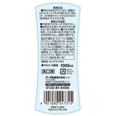 もんだみん、マウスウォッシュ、まうすうぉっしゅ、洗口液、口腔ケア、口臭ケア、オーラルケア、口臭予防、口臭対策、虫歯予防、虫歯対策、歯周病予防、歯肉炎予防、予防、対策、大容量、液体、液剤、アース