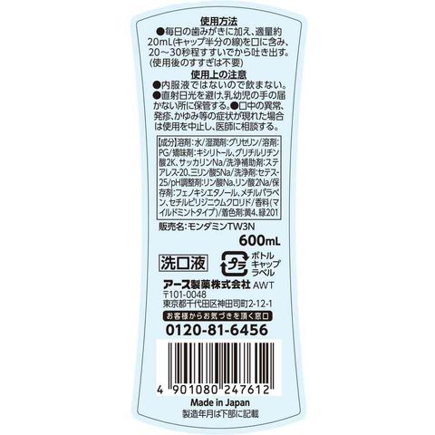 もんだみん、マウスウォッシュ、まうすうぉっしゅ、洗口液、口腔ケア、口臭ケア、オーラルケア、口臭予防、口臭対策、虫歯予防、虫歯対策、歯周病予防、歯肉炎予防、予防、対策、大容量、液体、液剤、アース
