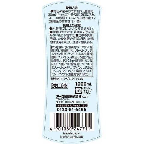 もんだみん、マウスウォッシュ、まうすうぉっしゅ、洗口液、口腔ケア、口臭ケア、オーラルケア、口臭予防、口臭対策、虫歯予防、虫歯対策、歯周病予防、歯肉炎予防、予防、対策、大容量、液体、液剤、アース