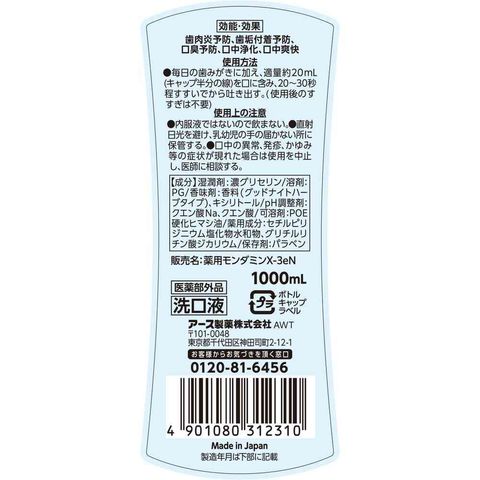 もんだみん、マウスウォッシュ、まうすうぉっしゅ、洗口液、口腔ケア、口臭ケア、オーラルケア、口臭予防、口臭対策、虫歯、歯周病、歯肉炎、予防、対策、夜用、夜、寝る前、液体、液剤、低刺激、アルコールフリー、アース