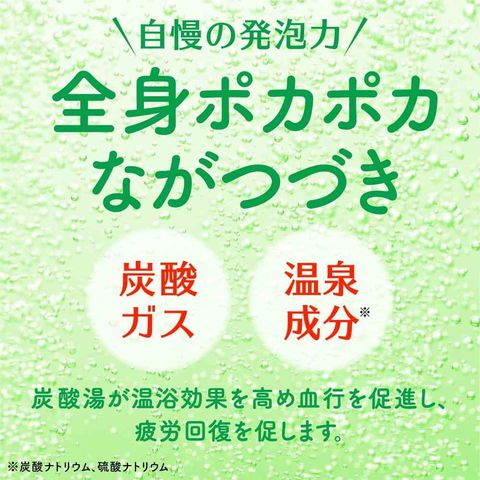温泉成分(炭酸ナトリウム、硫酸ナトリウム)と炭酸ガスが温浴効果を高め、血行を促進し、肩こり・腰痛・冷え症に効果があり、1日の疲れをやわらげます。 湯上がり後もポカポカ感が持続します。 葛根&生姜成分配合(保湿成分) 青森ヒバオイル配合(香料) 香料中に、青森県の「青森ヒバ」から抽出したオイルを配合しています。 「青森ヒバ」は日本三大美林の1つであり、気分安らぐ香りを持つ香木として知られています。 泡とともに広がる4種類の森の香り 【森】気分安らぎリラックス感をもたらす「森」。森にこだわり、4種類の香りを詰め合わせた炭酸タイプの入浴剤です。 ●若葉の森の香り ●濃緑(のうりょく)の森の香り ●針葉樹の森の香り ●大樹の森の香り ※アレルギーテスト済み(全ての方にアレルギーが起きないというわけではありません。)