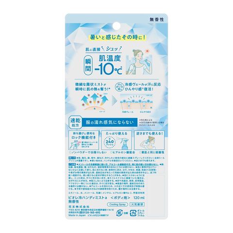 暑いと感じたその時に!肌に直接シュッ。 瞬間肌温度-10度* 微細な霧状ミストが瞬時に肌の熱を奪う!* 汗をかいた時も冷感ヴェールが汗に反応。 ひんやり感※復活! 速乾処方。 服の濡れ感気にならない。 *気化熱による *30度の屋外で使用した場合 ※メントールによる 持ち運びに便利なロック機能付き。 たっぷり使える約240プッシュ。 逆さまでも使える! ○ノンパウダーで白残りしない ○ヒアルロン酸配合 ○素肌と同じ弱酸性