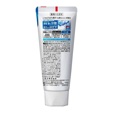 基剤:水、ソルビット液 清掃剤:無水ケイ酸 清浄剤:エリスリトール 湿潤剤:PG、濃グリセリン 粘度調整剤:無水ケイ酸、CMC・Na 発泡剤:ヤシ油脂肪酸アミドプロピルベタイン液、ラウリル硫酸塩 香味剤:香料(クリーンミントタイプ)、サッカリンNa 薬用成分:フッ化ナトリウム(フッ素)、β-グリチルレチン酸(BGA)、塩化セチルピリジニウム(CPC) 着色剤:酸化Ti 粘結剤:キサンタンガム 洗浄剤:ミリストイルグルタミン酸Na pH調整剤:水酸化ナトリウム液 清掃助剤:無水ピロリン酸Na