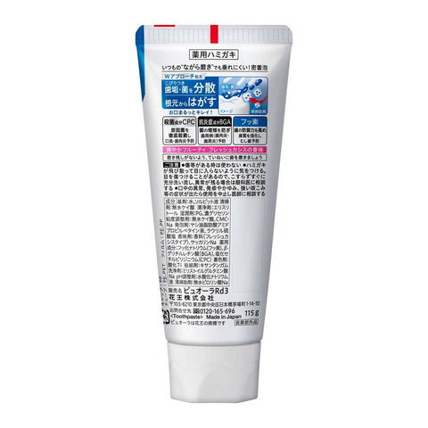 基剤:水、ソルビット液 清掃剤:無水ケイ酸 清浄剤:エリスリトール 湿潤剤:PG、濃グリセリン 粘度調整剤:無水ケイ酸、CMC・Na 発泡剤:ヤシ油脂肪酸アミドプロピルベタイン液、ラウリル硫酸塩 香味剤:香料(フレッシュカシスタイプ)、サッカリンNa 薬用成分:フッ化ナトリウム(フッ素)、β-グリチルレチン酸(BGA)、塩化セチルピリジニウム(CPC) 着色剤:酸化Ti 粘結剤:キサンタンガム 洗浄剤:ミリストイルグルタミン酸Na pH調整剤:水酸化ナトリウム液 清掃助剤:無水ピロリン酸Na