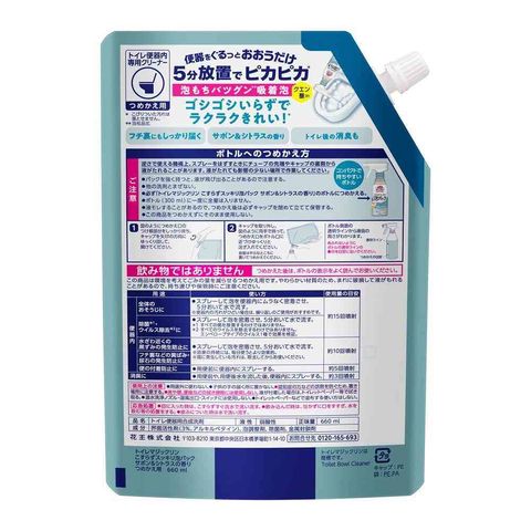 花王株式会社、kao、マジックリン、トイマジ、こすらずスッキリ、泡パック、トイレ、トイレ掃除、トイレの洗剤、洗剤、こすらない、つけ置き、つけ置き洗浄、泡、泡スプレー、パック、汚れ、黒ずみ、消臭、防臭、除菌、洗浄、臭わない、サボン、シトラス、詰替、詰替え、つめかえ、レフィル、入替、いれかえ、ストック
