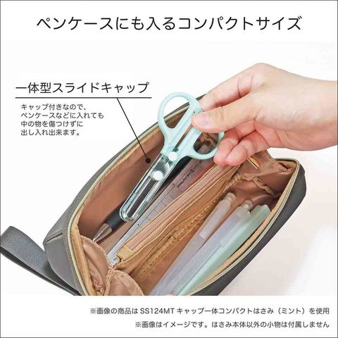ハサミ本体と一体型のスライドキャップを採用することでキャップの紛失を防止します。