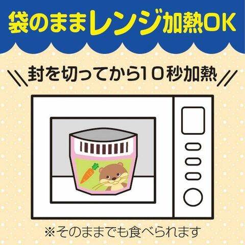 ▲700W以上の高出力電子レンジではワット数を下げて加熱してください。 ▲加熱手順、条件をお守りください。 ▲温めた後に、中身がはねてヤケドをする恐れがありますのでご注意ください。 ▲ヤケドをしないようにお子さまにあげる前に温度をお確かめください。 開封時、液はね注意 オート加熱不可 ヤケド注意 切りくち注意