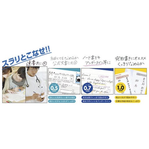 油性の「しっかりした手ごたえ」と水性の「さらさらした軽い書き味」を併せ持ったゼブラ独自のエマルジョンインク搭載。 耐水性、耐光性に優れており、公式文書にも使用できます。
