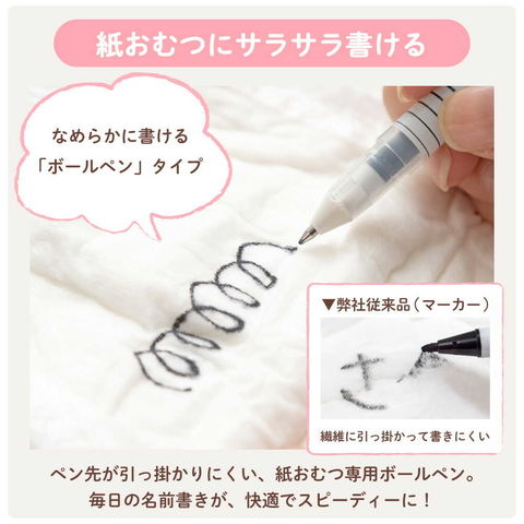 ●紙おむつの表面繊維に引っ掛からず、滑らかに筆記可能な紙おむつ専用ペン。