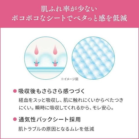 ●吸収体が動きに合わせてフィット。肌とナプキンがこすれにくい。※肌への摩擦によるせん断応力を約20%低減。(当社従来比)