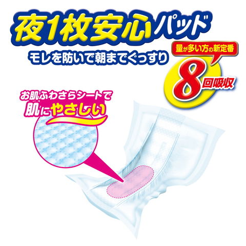 ●夜間安心の1,200ml吸収量。量が多い方でも一晩中安心の約8回分吸収。●より多くの方にお使いいただける「安心の吸収量とお求めやすさ」を両立、必要な吸収回数がわからず、お悩みの方にもおすすめ。●肌への接触面積を低減する「お肌ふわさらシート」でふわふわやわらかく快適!●全面通気性シート採用。●消臭加工。
