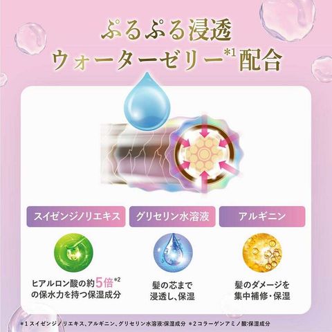 朝起きてから1日中素直にまとまるツヤ髪へ。 ラックス独自の保水ケア美容なら髪1本1本に水分チャージ&キープするから、髪の芯までうるおいで満たされる。 その秘密は、髪内部にとどまる、ぷるぷる浸透ウォーターゼリー配合処方。 うねる髪に。 水溶性加水分解ケラチン配合。 髪内部の水分の偏りを整える。 ダマスクローズ&カシスの華やかで上品な香り。