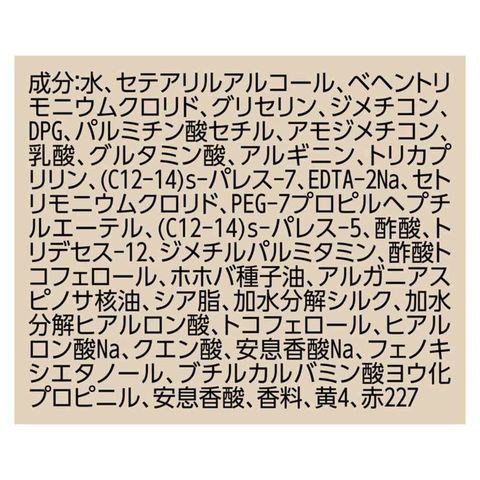 水、セテアリルアルコール、ベヘントリモニウムクロリド、グリセリン、ジメチコン、DPG、パルミチン酸セチル、アモジメチコン、乳酸、グルタミン酸、アルギニン、トリカプリリン、(C12-14)s-パレス-7、EDTA-2Na、セトリモニウムクロリド、PEG-7プロピルヘプチルエーテル、(C12-14)s-パレス-5、酢酸、トリデセス-12、ジメチルパルミタミン、酢酸トコフェロール、ホホバ種子油、アルガニアスピノサ核油、シア脂、加水分解シルク、加水分解ヒアルロン酸、トコフェロール、ヒアルロン酸Na、クエン酸、安息香酸Na、フェノキシエタノール、ブチルカルバミン酸ヨウ化プロピニル、安息香酸、香料、黄4、赤227