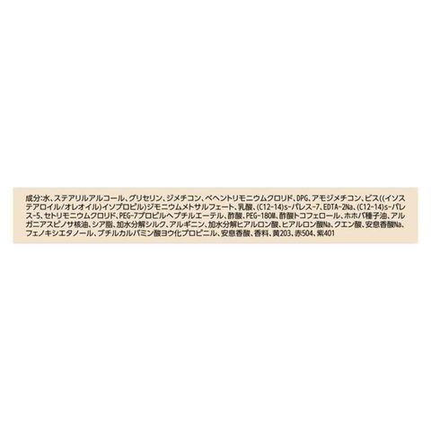 水、ステアリルアルコール、グリセリン、ジメチコン、ベヘントリモニウムクロリド、DPG、アモジメチコン、ビス((イソステアロイル/オレオイル)イソプロピル)ジモニウムメトサルフェート、乳酸、(C12-14)s-パレス-7、EDTA-2Na、(C12-14)s-パレス-5、セトリモニウムクロリド、PEG-7プロピルヘプチルエーテル、酢酸、PEG-180M、酢酸トコフェロール、ホホバ種子油、アルガニアスピノサ核油、シア脂、加水分解シルク、アルギニン、加水分解ヒアルロン酸、ヒアルロン酸Na、クエン酸、安息香酸Na、フェノキシエタノール、ブチルカルバミン酸ヨウ化プロピニル、安息香酸、香料、黄203、赤504、紫401
