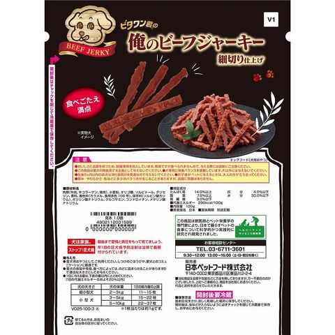 噛むたびに旨さ広がるビーフジャーキー。小型犬にも与えやすい細切り仕上げ。