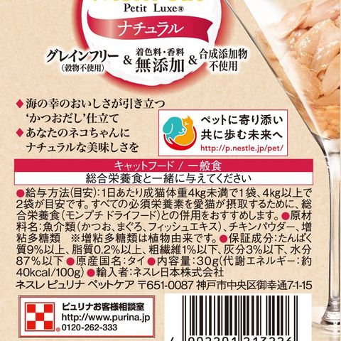 着色料・香料無添加、合成添加物も不使用のナチュラルパウチ。あなたのネコちゃんに’かつおだし’仕立てのナチュラルな美味しさを。