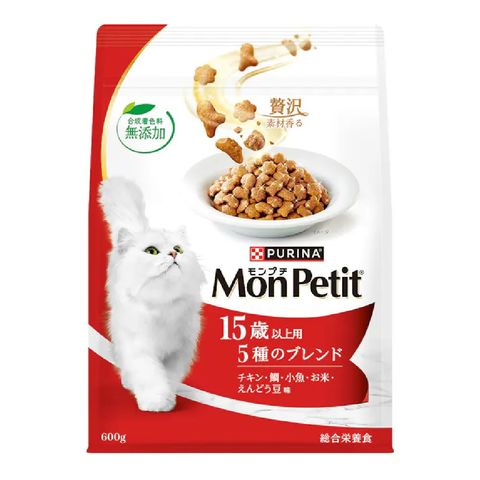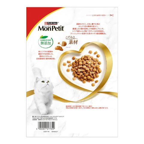 穀類(米、小麦、コーングルテン、小麦たんぱく 等)、肉類(チキンミール、ターキーミール 等)、油脂類(動物性油脂、フィッシュオイル)、たんぱく加水分解物、えんどう豆、フィッシュパウダー(鯛、小魚)、ミネラル類(カルシウム、リン、カリウム、ナトリウム、クロライド、マグネシウム、鉄、銅、マンガン、亜鉛、ヨウ素、セレン)、ビタミン類(A、D、E、B1、B2、パントテン酸、ナイアシン、B6、葉酸、ビオチン、B12、コリン)、アミノ酸類(メチオニン、タウリン)