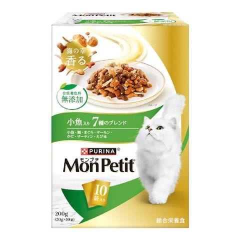 穀類(とうもろこし、とうもろこしたんぱく、小麦、米等)、肉類(チキンミール等)、動物性油脂、魚介類(まぐろ、かつお、小魚)、たんぱく加水分解物、フレーバーブレンド(鯛、サーモン、かに、サーディン、えび等)、ミネラル類(カルシウム、リン、カリウム、ナトリウム、クロライド、鉄、銅、マンガン、亜鉛、ヨウ素、セレン)、ビタミン類(A、E、K、B1、B2、パントテン酸、ナイアシン、B6、葉酸、ビオチン、B12、コリン)、アミノ酸類(メチオニン、タウリン)、着色料(カラメル色素、カロテノイド色素)