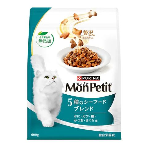 穀類(とうもろこし、とうもろこしたんぱく、小麦、米等)、肉類(チキンミール等)、動物性油脂、魚介類(まぐろ、かつお)、たんぱく加水分解物、フレーバーブレンド(かに、えび、鯛等)、ミネラル類(カルシウム、リン、カリウム、ナトリウム、クロライド、鉄、銅、マンガン、亜鉛、ヨウ素、セレン)、ビタミン類(A、E、K、B1、B2、パントテン酸、ナイアシン、B6、葉酸、ビオチン、B12、コリン)、アミノ酸類(メチオニン、タウリン)、着色料(カラメル色素、カロテノイド色素)
