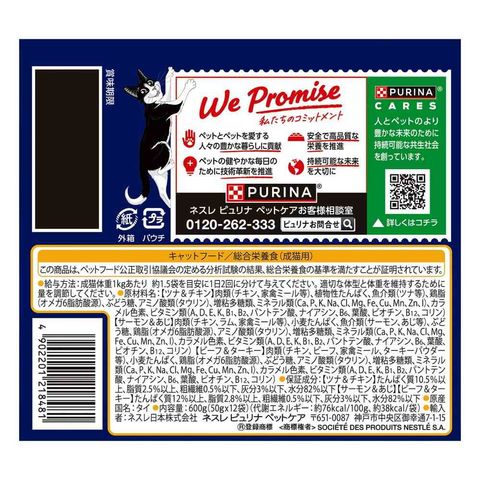 <ツナ&チキン>肉類(チキン、家禽ミール等)、植物性たんぱく、魚介類(ツナ等)、鶏脂(オメガ6脂肪酸源)、ぶどう糖、アミノ酸類(タウリン)、増粘多糖類、ミネラル類(Ca、P、K、Na、Cl、Mg、Fe、Cu、Mn、Zn、I)、カラメル色素、ビタミン類(A、D、E、K、B1、B2、パントテン酸、ナイアシン、B6、葉酸、ビオチン、B12、コリン)<サーモン&あじ>肉類(チキン、ラム、家禽ミール等)、小麦たんぱく、魚介類(サーモン、あじ等)、ぶどう糖、鶏脂(オメガ6脂肪酸源)、アミノ酸類(タウリン)、増粘多糖類、ミネラル類(Ca、P、K、Na、Cl、Mg、Fe、Cu、Mn、Zn、I)、カラメル色素、ビタミン類(A、D、E、K、B1、B2、パントテン酸、ナイアシン、B6、葉酸、ビオチン、B12、コリン)<ビーフ&ターキー>肉類(チキン、ビーフ、家禽ミール、ターキーパウダー等)、小麦たんぱく、鶏脂(オメガ6脂肪酸源)、ぶどう糖、アミノ酸類(タウリン)、増粘多糖類、ミネラル類(Ca、P、K、Na、Cl、Mg、Fe、Cu、Mn、Zn、I)、カラメル色素、ビタミン類(A、D、E、K、B1、B2、パントテン酸、ナイアシン、B6、葉酸、ビオチン、B12、コリン)