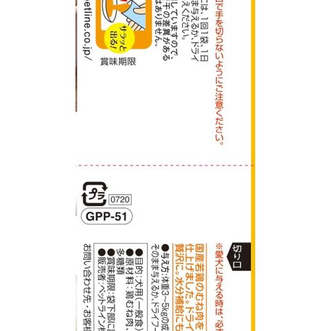国産若鶏を使用した、便利なスリムパウチ。普段の食事はもちろん、お散歩のおやつにもぴったり。