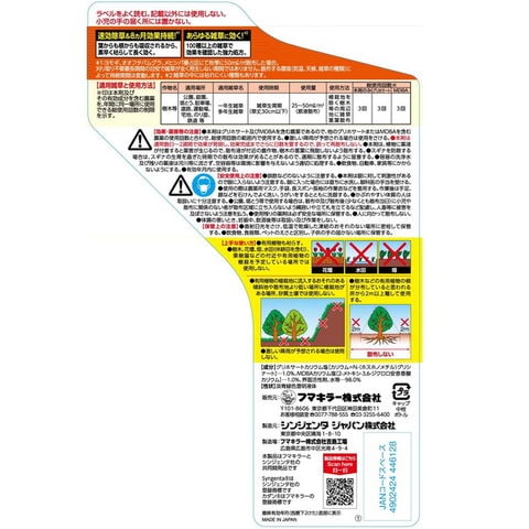 ●速効除草&長期効果パワフル&ロングのダブル除草成分ですばやく枯らし、最長8ヵ月効果が続きます。● 100 種以上の雑草で効果を確認おうち周りのさまざまな雑草で効果を確認。ドクダミやスギナ、ススキなどしつこい雑草もしっかり枯らします。●根からも葉からも吸収散布するだけで葉からも根からも吸収される“MDBA カリウム塩”と、葉茎から浸透した薬剤が根まで浸透してしっかり枯らす“グリホサートカリウム塩”がさまざまな雑草に優れた効果を発揮します。