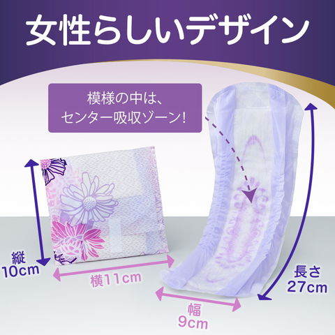 「ウィスパー うすさら安心 女性用 吸水ケア 120cc 多いときでも安心用 ナプキン型尿ケアパッド 16枚入り 27cm (多い量の尿モレ用)」は、 ぬれてもスリムシートで、モレ・ぬれ感・においを防ぎます。 超スピード消臭技術で吸水後のにおいもすぐに消臭し、吸水後もスリムシートでうすくてさらさら。 横モレ防止ギャザーが、横モレをしっかりガードするから安心です。