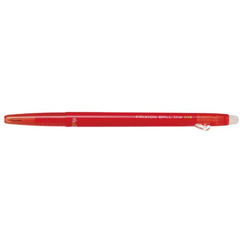 ●消せるボールペン、フリクション スリム ●フリクションシリーズで最も細書きのボール径0.38mmの消えるボールペン ●教科書などへの細かな文字の書き込みに適した超極細タイプです ●ボディも細身でかさばらないから、ペンケースなどにもたくさん入ります ※フリクションは消せる筆記具です。証書類・宛名など消えてはいけないものには使用しないでください。 ●本体色:レッド ●インキ色:レッド