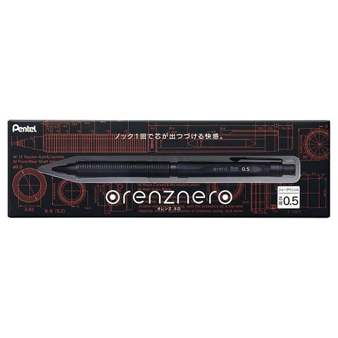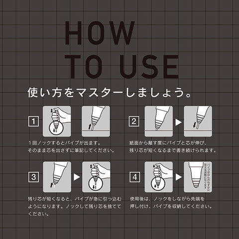 先端パイプがスライドするオレンズシステムに加え、ペン先を紙面から離すたびに芯が出てくる自動芯出し機構を搭載。