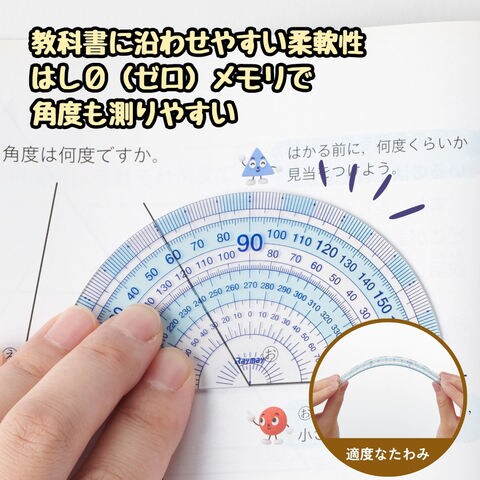 ●線を引いたり、角度を測ること以外には使用しないでください。 ●分度器の角や、とがった先を人に向けたりしないでください。 ●破損の原因となりますので、叩いたり、曲げたりしないでください。 ●変形防止のため、温度の高い場所に置いたり、シンナーなどの薬品でふかないでください。