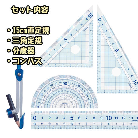 ●学校の先生と共同開発!現場の先生だからわかる、学習しやすい定規シリーズです。 ●握力の弱い子でもおさえやすい。すーっと自然に滑って、指で押さえればぴたっと止まる新感覚の「すべりどめ」付き。 ●対象物に合わせて測りやすい、はし0(ゼロ)メモリも採用。 ●セット内容:直定規、三角定規、分度器、鉛筆用コンパス