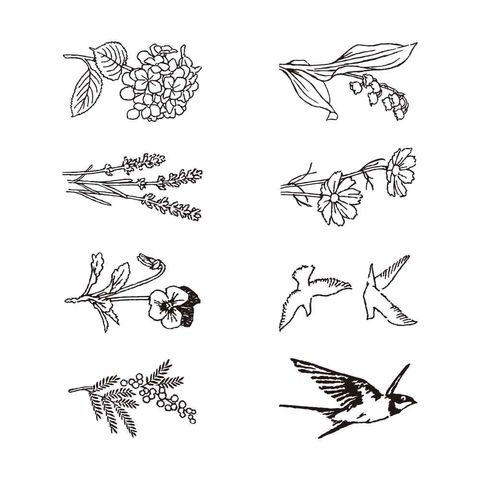 季節を問わずに人気のある花に、その周りを飛ぶトリたちを加えたデザインです。