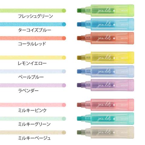 ブライト、パステル、ミルキーという3本のジョインドッツがセットになり、ライト系の合計9色がすべて楽しめるセットです。