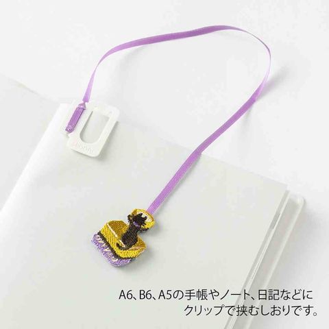 手帳や日記などにクリップで挟み込むだけで、かわいい刺繍チャームがついたしおりになります。