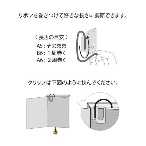 クリップ部分にしおり紐を巻きつけることで長さを調整することができますので、挟む手帳やノートのサイズに合わせてお使いいただけます。