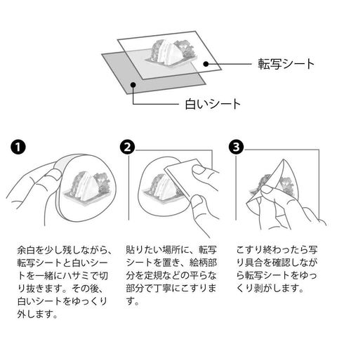 軽い力でこすると、絵を描いたように紙と一体化する転写タイプのシールです。