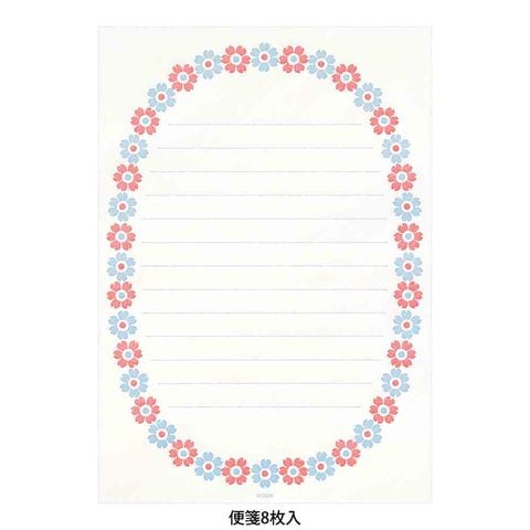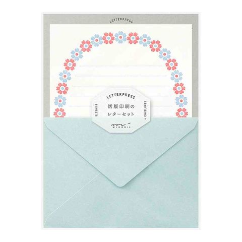 ミドリ レターセット478 活版 花フレーム柄 水色 便箋/8枚入、封筒/4枚入