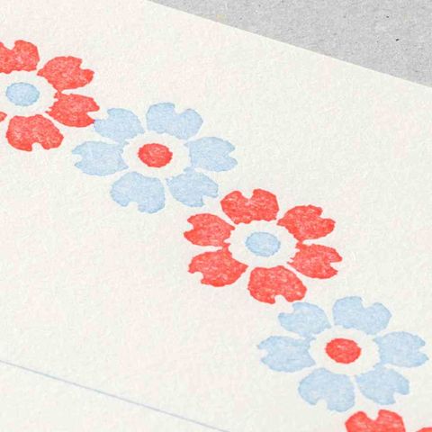 鮮やかな赤と水色の組み合わせた花フレーム柄は、様々なシーンで活躍します。