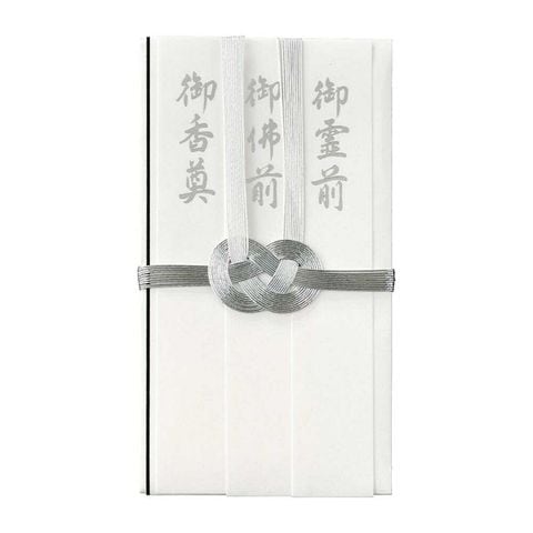 ●銀色の箔押し加工された「御霊前」、「御佛前」、「御香奠」、「御布施」、「お花料」の短冊5枚付。