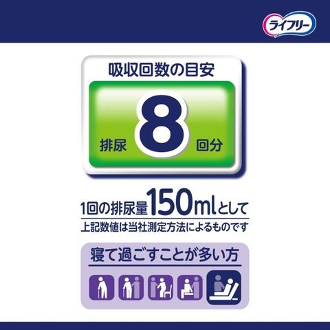たっぷり8回分をぐんぐん吸収するので、尿量の多い方でも一晩中安心な尿とりパッドです。